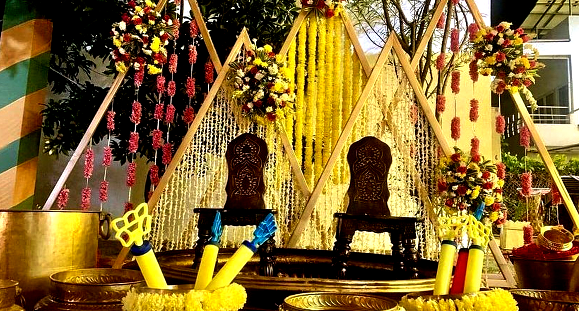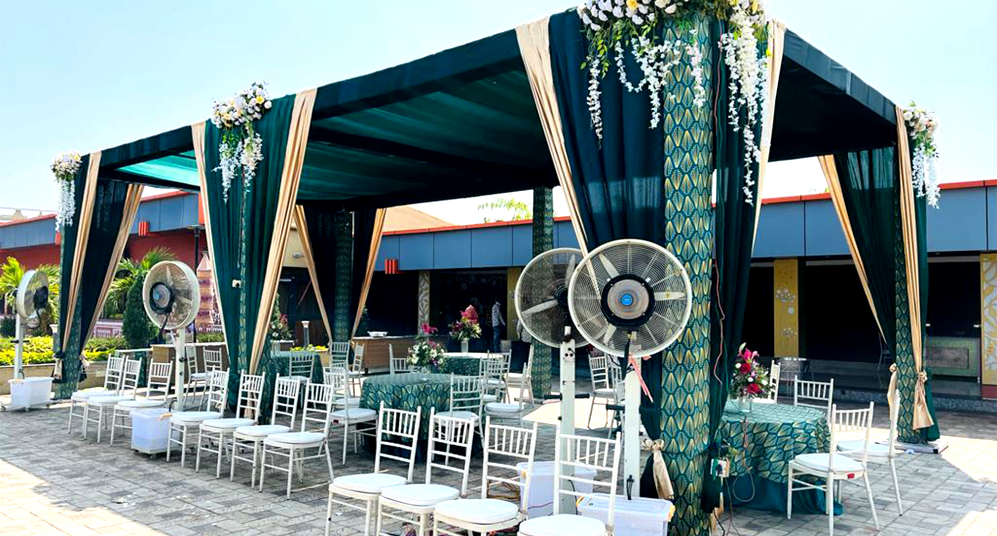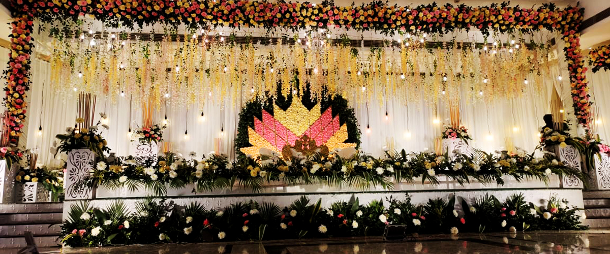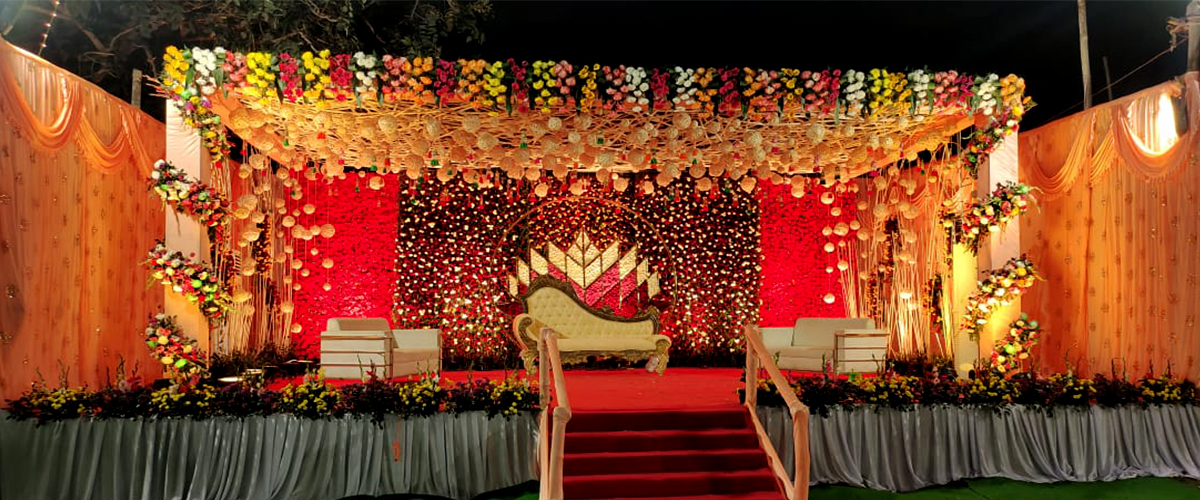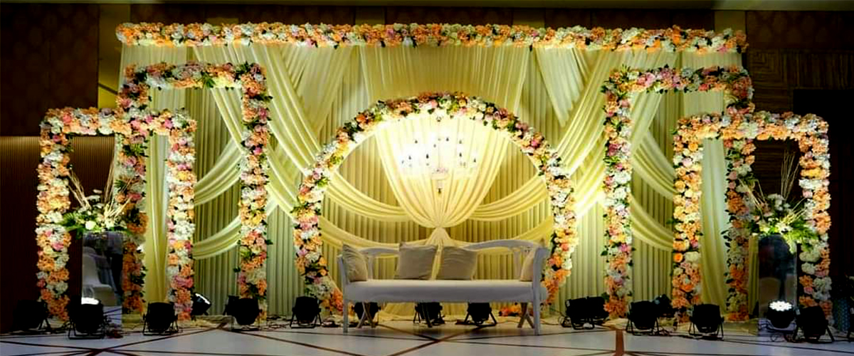 The Royal Entry welcomes you to the Ornate Passage that reserve their Charm under the shine of Antique Hangings. Following with the Round Tables & Banquet Chairs, along with the tremendous stage with backdrop. 'n' You can Picture with ease.